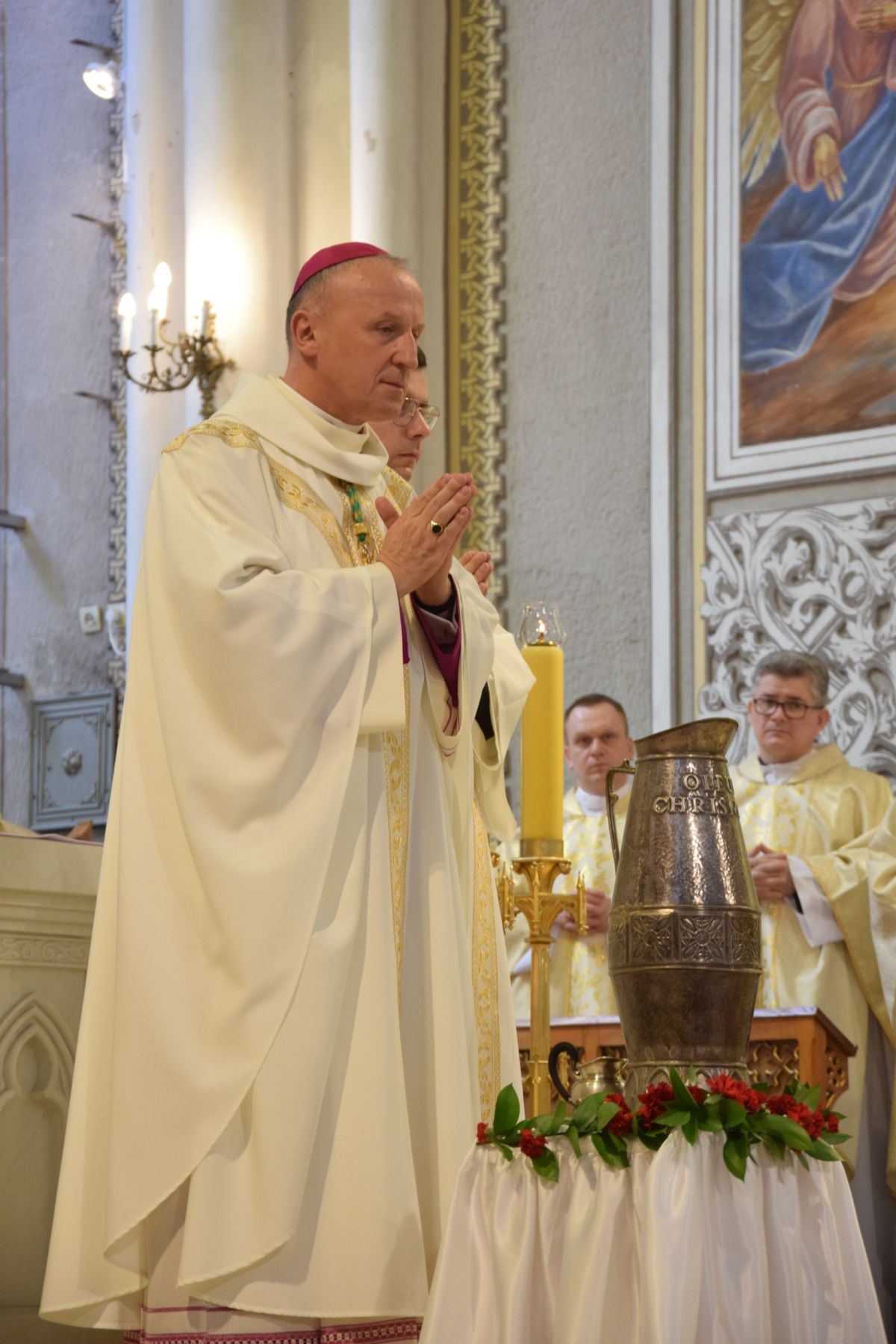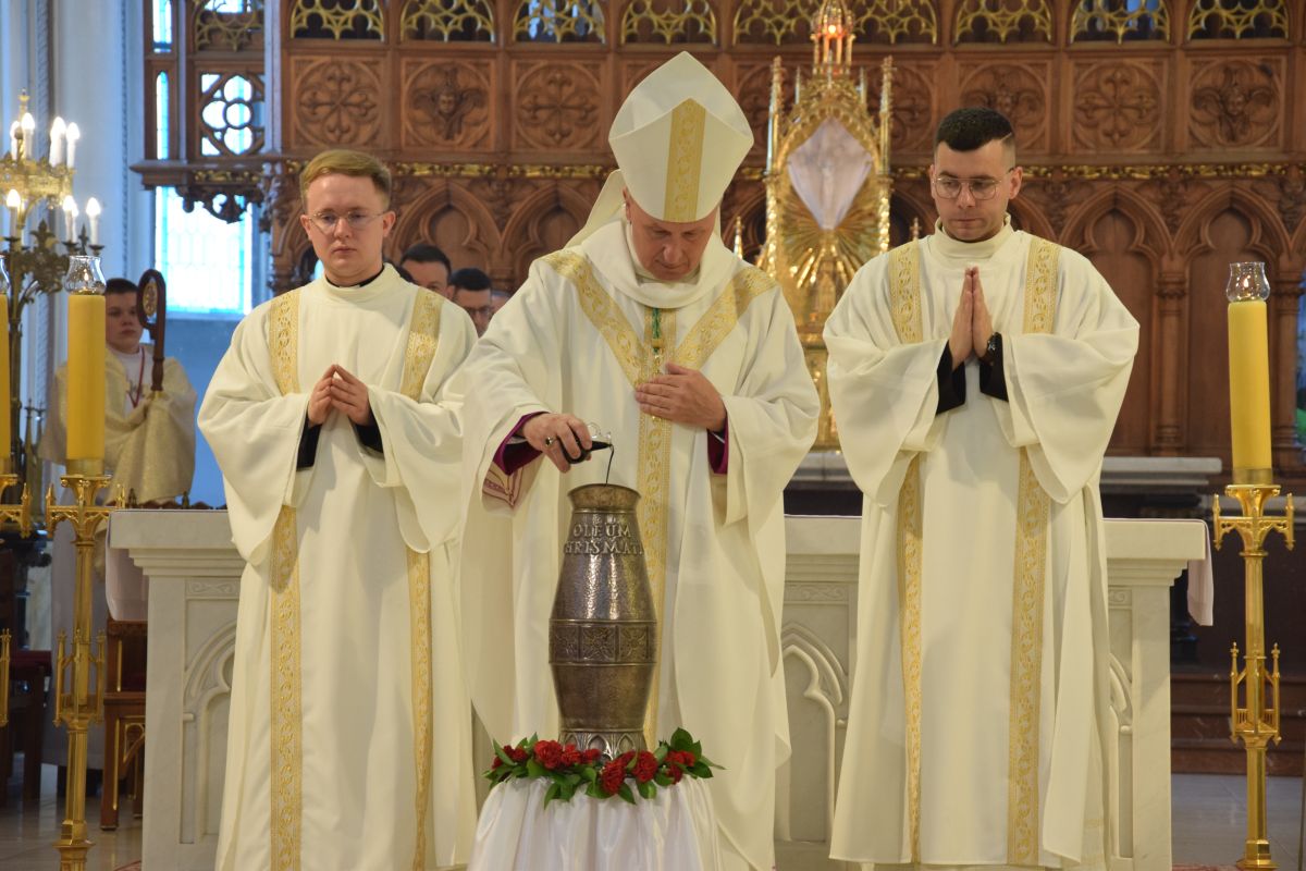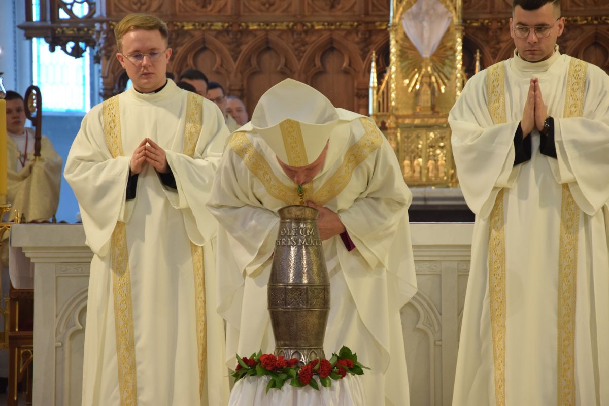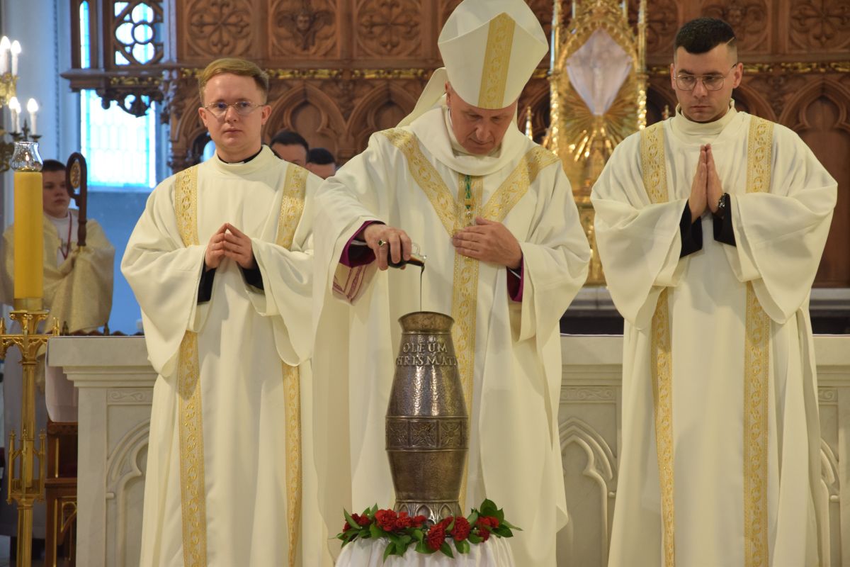 Podczas liturgii poświęcone zostało krzyżmo oraz oleje chorych. Krzyżmo to olej z oliwek, zmieszany z ciemnym balsamem. Używa się go przy sakramencie chrztu i bierzmowania, sakramencie kapłaństwa, przy dedykacji kościoła i ołtarza.