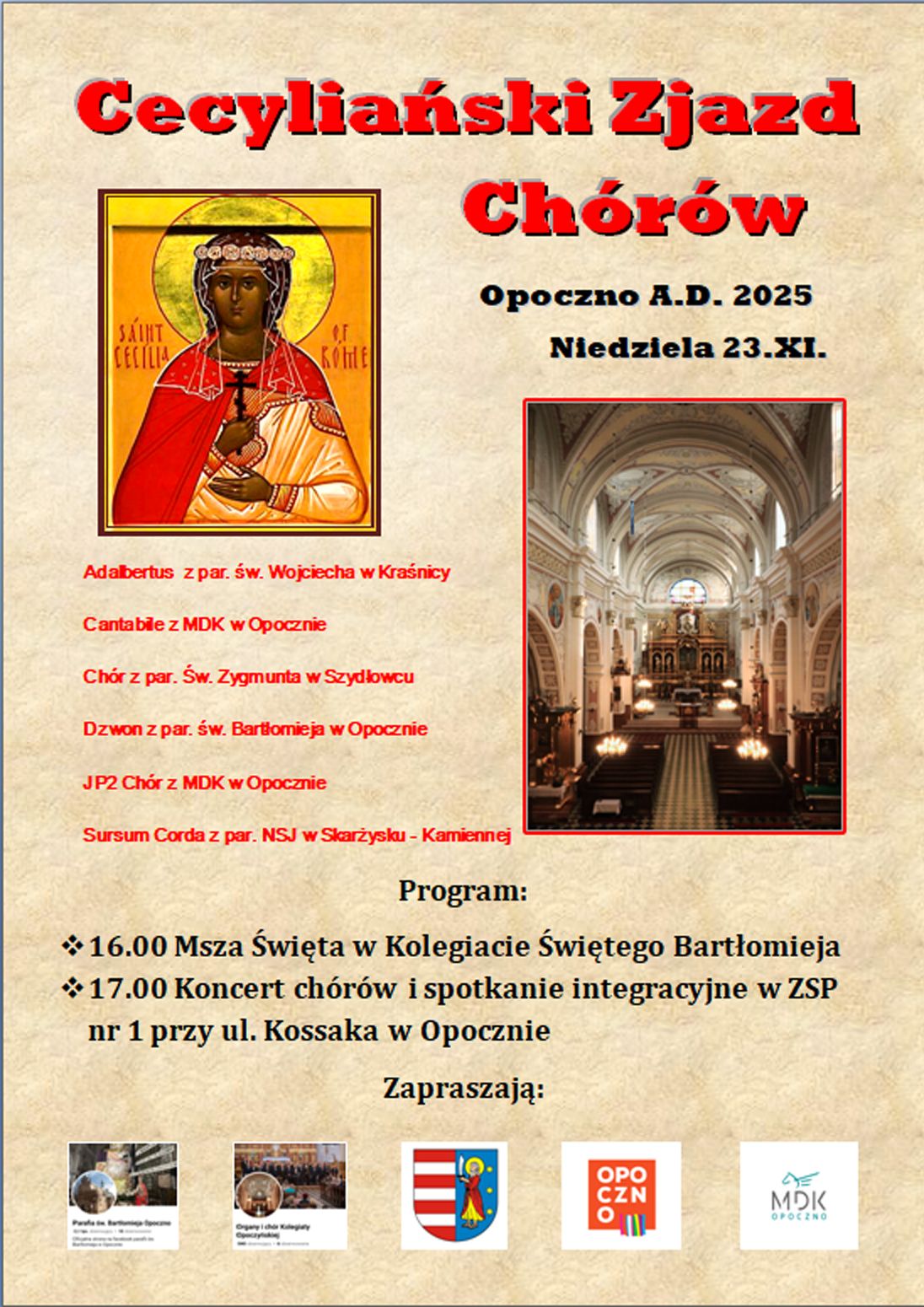 Cecyliański Zjazd Chórów odbędzie się w Opocznie w najbliższą niedzielę (23 listopada). Rozpocznie się od Mszy Świętej odprawionej o godzinie 16 w opoczyńskiej kolegiacie św. Bartłomieja. Same występy chórów rozpoczną się około godziny 17 w budynku Zespołu Szkół Powiatowych w Opocznie. Przed publicznością zaprezentuje się zespoły z Opoczna, Kraśnicy, Szydłowca i Skarżyska-Kamiennej. Na wydarzenie zaprasza jego organizator Michał Bociek, organista w parafii św. Bartłomieja: