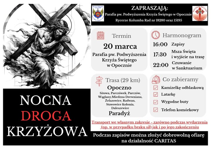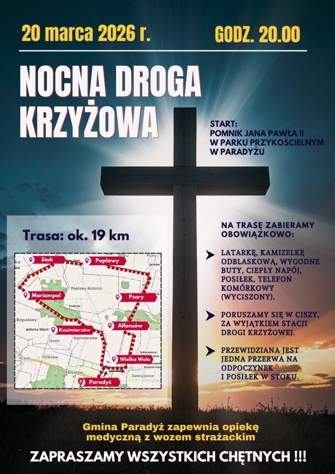 Do Paradyża pielgrzymować będą także uczestnicy Nocnej Drogi Krzyżowej, która wyruszy z Opoczna. Zapraszają na nie wspólnie z parafią Podwyższenia Krzyża Świętego miejscowi Rycerze Kolumba. Jak wyjaśnia Wielki Rycerz Jarosław Jach, wyjście nastąpi po Mszy świętej o godzinie 17.30.