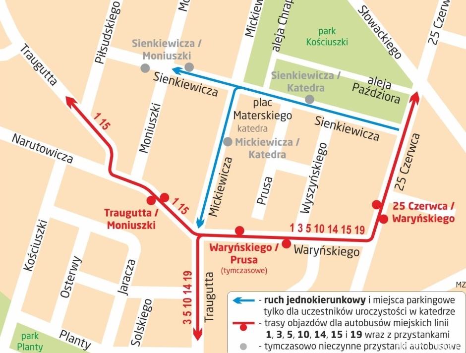 W związku ze zmianą organizacji ruchu do Katedry Radomskiej będzie możliwy dojazd tylko od ul. 25 – Czerwca. Ul. Sienkiewicza, ul. Mickiewicza wokół Katedry będą jednokierunkowe. Organizatorzy zachęcają do zapoznania się z mapą organizacji ruchu przygotowaną przez MZDiK, która zawiera również zmienione trasy autobusów komunikacji miejskiej obowiązujące tego dnia w godzinach około 5:00-14:00.