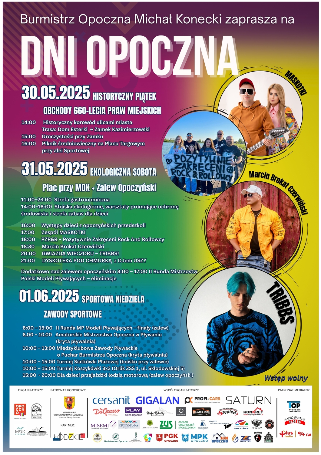 Tegoroczne obchody święta miasta podzielone zostały na trzy tematyczne dni. Piątek związany będzie z historią, a dokładnie z 660. rocznicą nadania Opocznu praw miejskich. Właśnie tego dnia historyczny korowód przejdzie ulicami miasta. Nie zabraknie także średniowiecznego pikniku na placu targowym. Sobota to dzień ekologii i koncertów. Na placu przy MDK będą liczne stoiska promujące ochronę środowiska. Nie zabraknie także strefy zabaw dla dzieci. Gwiazdą wieczoru będzie Tribbs. Niedziela to przedsięwzięcia sportowe. Będą zawody pływackie oraz turnieje siatkówki i koszykówki. Również tego dnia nad zalewem przeprowadzona zostanie druga runda Mistrzostw Polski Modeli Pływających.